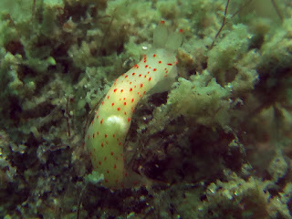 New Year's Eve - Our final dive for the year was undertaken in the Mooloolah River due to the unsuitable conditions being whipped up by the strong south to southeasterly winds blowing onshore. This site is usually of no hardship - easy access, easy diving and very often something new. The viz wasn't the best but it certainly made us look a lot closer. New species of Noumeaella (our sp. 2) and Facelina (our sp. 9) were discovered. We are yet to come to a conclusion about a small Philinopsis that looks somewhat like Philinopsis lineolata except that it is black with transverse stripes that are comprised of spots of various iridescent colours (bling). Whether this a juvenile presentation is being considered but it does not have the characteristic buccal hump of that species. A tiny unidentified Goniodorididae nudibranch was also detected but may be too juvenile to arrive at a positive ID.