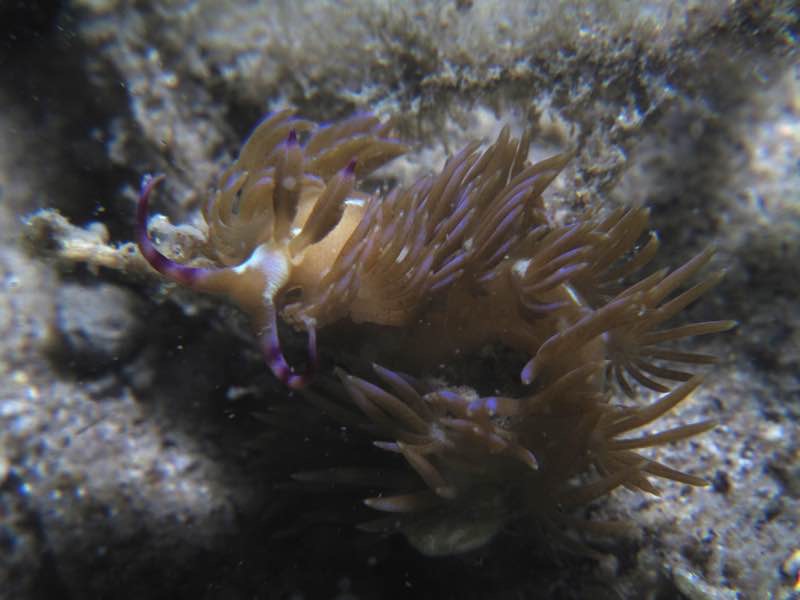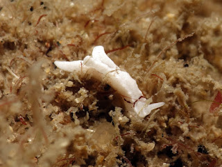We are noticing more and more Halimeda algae growing on the river substrate and providing habitat and food source for a variety of small sacoglossans and aplysiids. Doto sp. 3 were spotted in situ which is unusual as they are normally cryptic but these, for the first time, had orange colouration to their cerata. This is possibly due to the orange hydroid polyps they appeared to be feeding on.