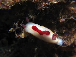 The swell had built a little since our last dive so we made the decision to venture to this slightly deeper site to try to avoid the worst of the surge. The surge was still strong at times and this possibly explains the slightly lower than usual species count for the area. The Pteraeolidia semperi were present everywhere and our species count probably underestimates their relative abundance. A nice find were the Phestilla melanobranchia which can be easy to miss because of their excellent camouflage.