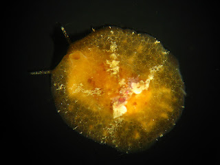 Aside from the species listed below, we also found a number of Lamellaria sp. These are possibly better known under their common name, Velvet Snails, and are often confused with opisthobranchs because of their small size and small internal shell that is covered with fleshy lobes. A photo of one is shown below - the pointed head tentacles emerging from under the body and anterior siphon are clearly visible. Clearly not opisthobranchs but often the cause of some initial excitement when found.