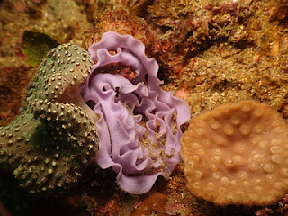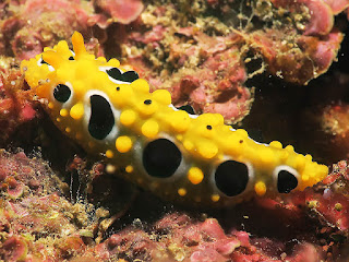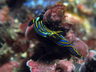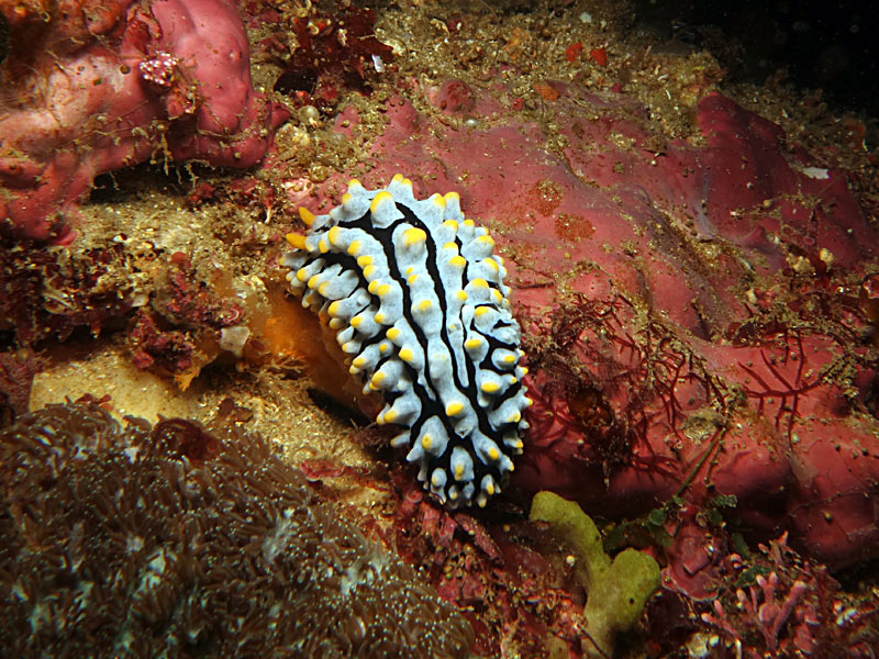 Colder dirty water greeted us as we descended on the dive. The River and Old Woman Island have been delivering 26-27 C water temperatures lately but the deeper sites are hanging on to their cooler water (relatively speaking that is). The ridges and ravines of this site provide a number of different habitats and this is reflected in the species count. The first thing to get our attention was the large numbers of Tylodina corticalis making a meal of their preferred grey/yellow sponge. Some of these sponges were totally decimated whilst others were covered in several of the feeding slugs or their spawn. It'll be a boom followed by a bust if the sponges don't keep up. Goniobranchus coi was a rare find especially at 70 mm in length - a new size record.
