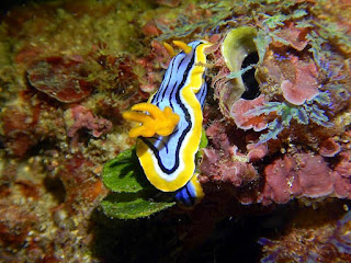 The weather forecast proved accurate in all respects apart from the predicted swell the size of which caught us by surprise making photography quite difficult. As previously experienced the swell has a definite effect upon the species count by way of both our ability to find slugs and the slugs own penchant for finding the nearest crevice in which to escape the constant to and fro. (We were seriously considering renaming this site "To & Fro".) However all was not lost as we found a specimen of a rarely seen slug - Miamira moloch and what a beauty it is too. We have found this species in several forms of external appearance over the years and the existence of these variations begs the question - is there more than one species amongst them all?