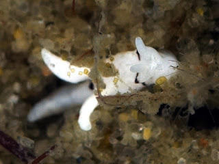 The day could not have been better, sunny and warm. Today I wore my drysuit for the first time this season and it worked a treat. From shore the water looked very clean. There were lots of Nudibranchs to be found. Three undescribed Goniodoridella species and very large Pteraeolidia.