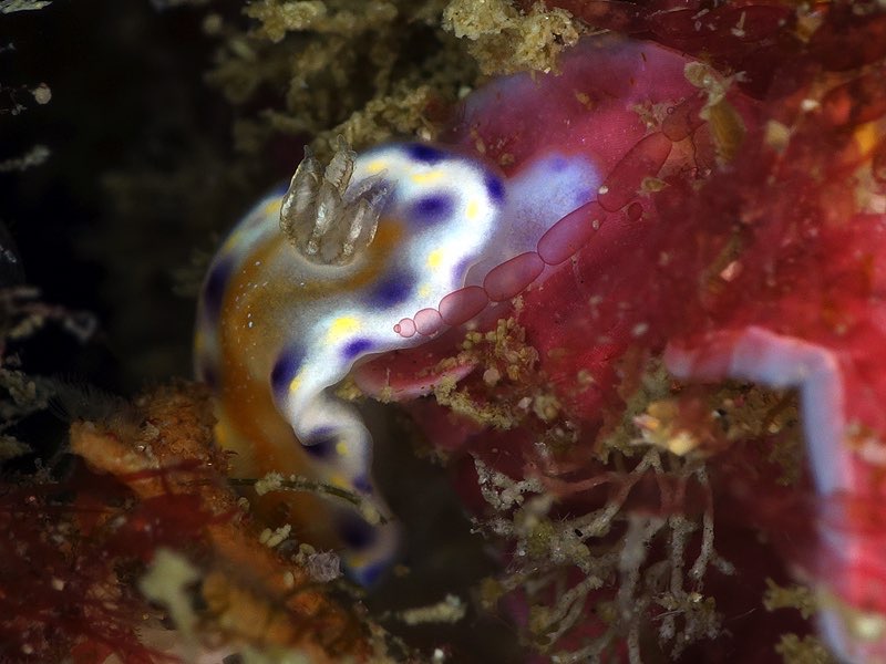 Earlier in the week Sunday looked like the most promising day however the weather forecast kept fluctuating and only looked suitable again late on Saturday. We headed for Old Woman Island with the intention of anchoring in the lee just in case the winds belied the forecast again. Unfortunately the swell was quite powerful (long period) which creates uncomfortable surge in shallow waters so, for this excursion we opted to visit a site we have not searched in almost 6 years. Back in 2012 was our last visit here when we were still operating the inflatable. On that visit we recorded 27 species but the viz at that time was only 5 m. Trench is one of our closest sites to the Mooloolah River entrance but still provides good depths to help mitigate the effects of the swell down below. As it happened the wind did not get above 10 knots except for a short period around midday. Today’s excursion turned up some interesting finds, some in pairs, such as: Crimora edwardsi, Verconia alboannulata, Verconia romeri, Diversidoris crocea and Hypselodoris zephyra. Other finds worth a special mention include Actinocyclus verrucosus together with its egg mass and the elegant coloured and patterned Goniobranchus coi. We concentrated our search on the northern wall that drops in a series of terraces to the sandy gutter - a wonderful variety of substrate. Next time we will swim across the Trench and explore the southern escarpment. Altogether a most rewarding excursion at a long neglected site.