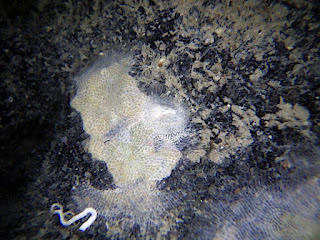 I can't say enough about midweek diving with plenty of parking! A 2.1 m tidal flow was thought to be way more with horizontal climbing the mode of searching. The challenge was on.At one point the current picked up to what seemed like 10 knots! I was holding on with both hands waiting for it cease. Cratena pawarshindeorum is in lots of places, in fact 35 animals were recorded! Amazing. See composite. Including some very tiny juveniles. A juvenile Hypselodoris jacksoni was spotted as well as a Placida kevinlee. When the current went away I got a chance to search the sand, quite a few bubble shells to record.