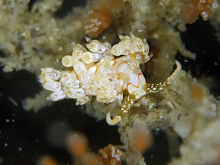 I yet again love midweek diving with plenty of parking! Cratena pawarshindeorum is still out in force, nice to see. A couple of Philinopsis falciphallus were recorded when night came. The first record of a Starfish, I know of in the river, was a surprise! In the beginning of the dive the vis was about 2 m as the tide came in it cleared to 4 m. A fresh water top layer made the substrate green. With the warmer water I wonder if that is affecting the species count... Flabellina sp. 7 was a great find and a new record for the river.