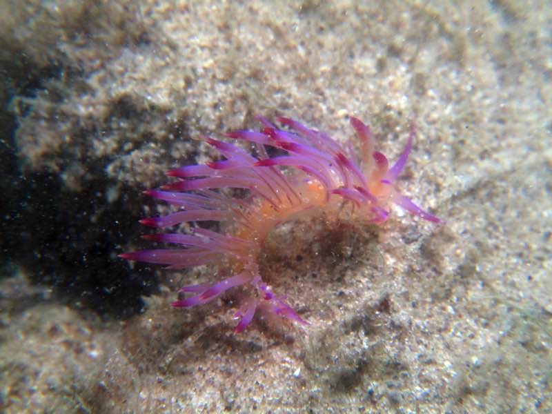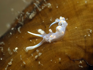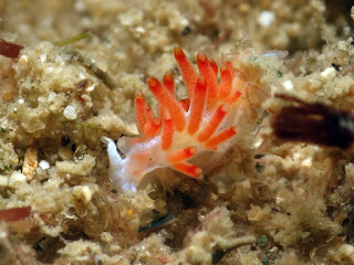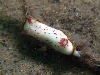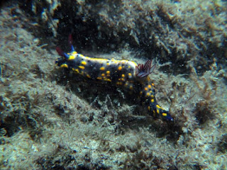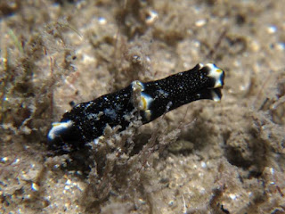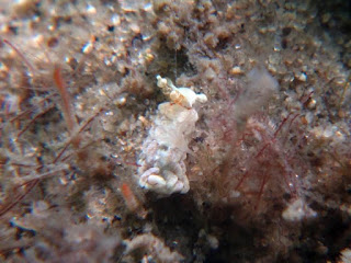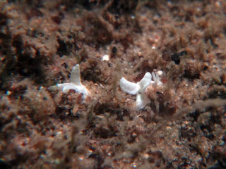 We entered the water at the set of stairs from La Balsa Park that are closest to the river mouth and swam into the incoming tide. This section has a substrate that is more gritty sand than the finer silt found just a short distance back upstream. Fortune smiled yet again upon us as we found two more species new to our list - Aglaja sp. 3 and Plocamopherus pecoso.