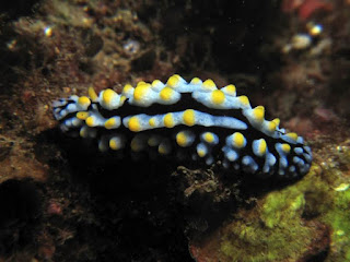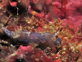 Flabellina angelvaldesi are still present in plague proportions such that we stopped counting them at 150. A couple of infrequently sighted species were seen. A pair of Phyllodesmium opalescens were found under a rock. They looked a little different with some features of the similar looking and recently described (2014) Phyllodesmium undulatum however we do not think it is that species. Water temperature is now down to 22 C that for slow long dives is starting to become uncomfortable.
